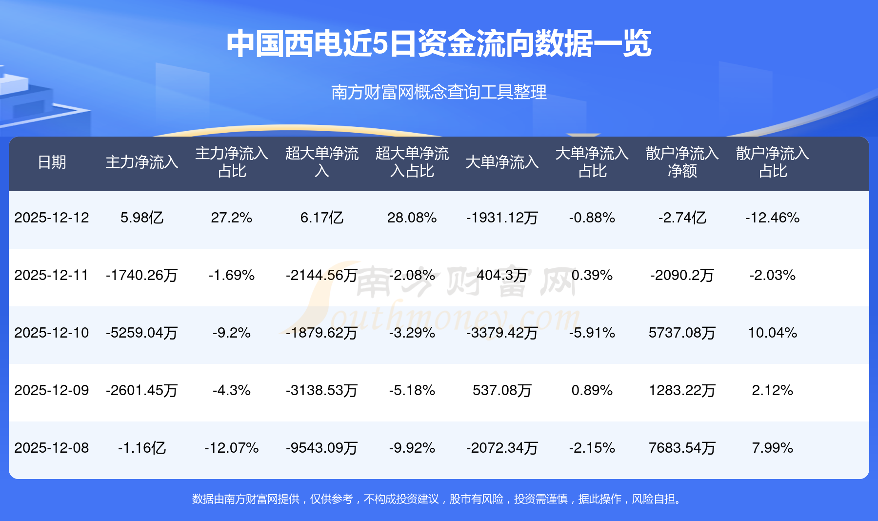 12月12日消息,中國西電主力凈流入5.98億元,超大單凈流入6.17億元,散戶凈流出2.74億元。