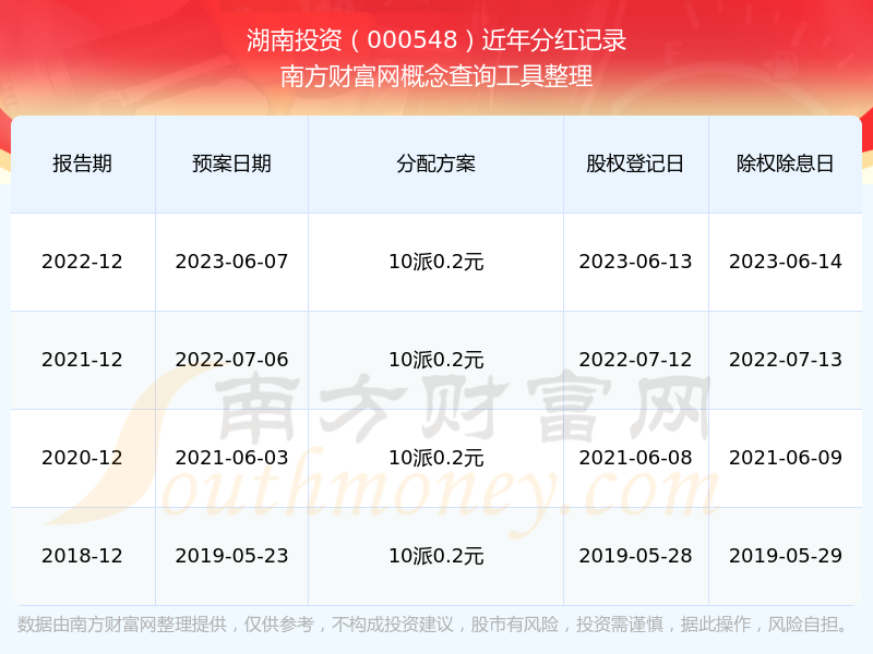 湖南投資最新一次公布的分紅方案:10派0.2元。