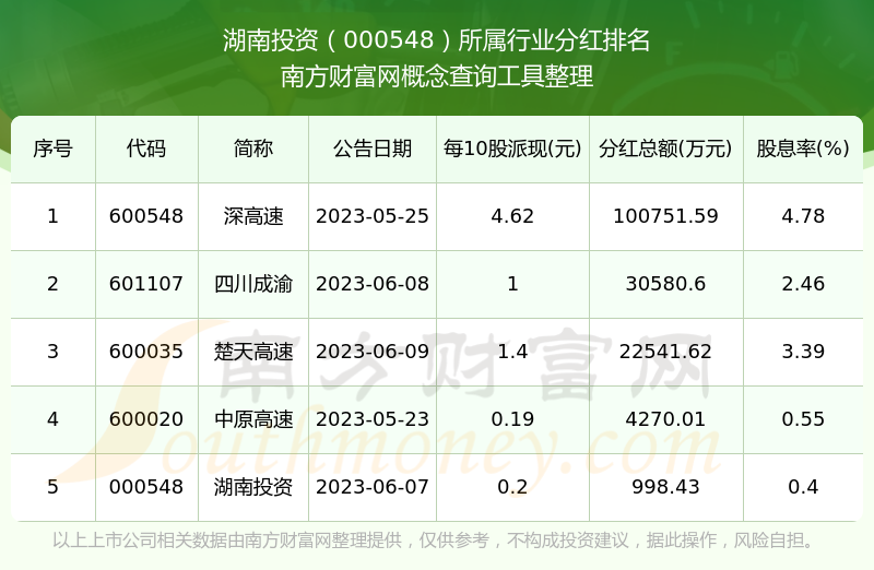 按照南方財(cái)富網(wǎng)趨勢選股系統(tǒng)統(tǒng)計(jì),湖南投資所屬行業(yè)為高速公路行業(yè),高速公路行業(yè)分紅排名情況如下表: