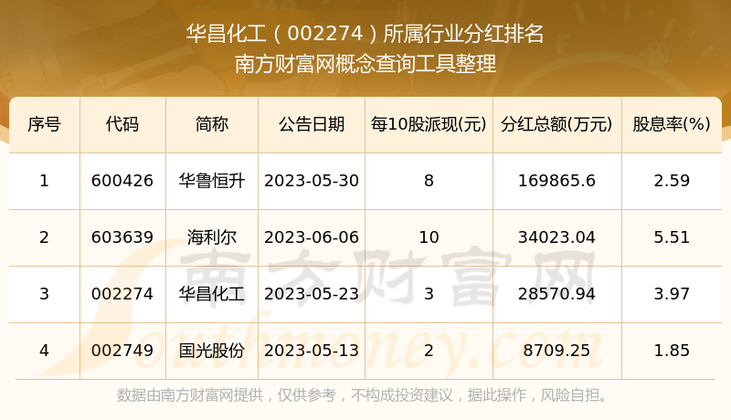 按照南方財富網(wǎng)趨勢選股系統(tǒng)統(tǒng)計,華昌化工所屬行業(yè)為肥料行業(yè),肥料行業(yè)分紅排名情況如下表: