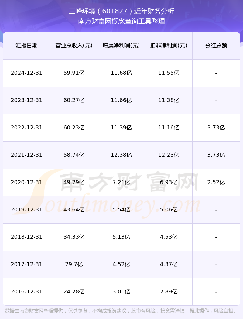 三峰環(huán)境公司2024年實(shí)現(xiàn)營(yíng)業(yè)收入59.91億元,同比增長(zhǎng)-0.59%;凈利潤(rùn)11.68億元,同比增長(zhǎng)0.2%;毛利率33.18%。