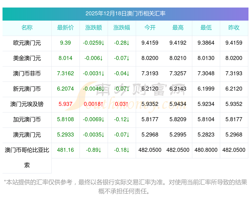 2025年12月18日澳門幣相關(guān)匯率查詢