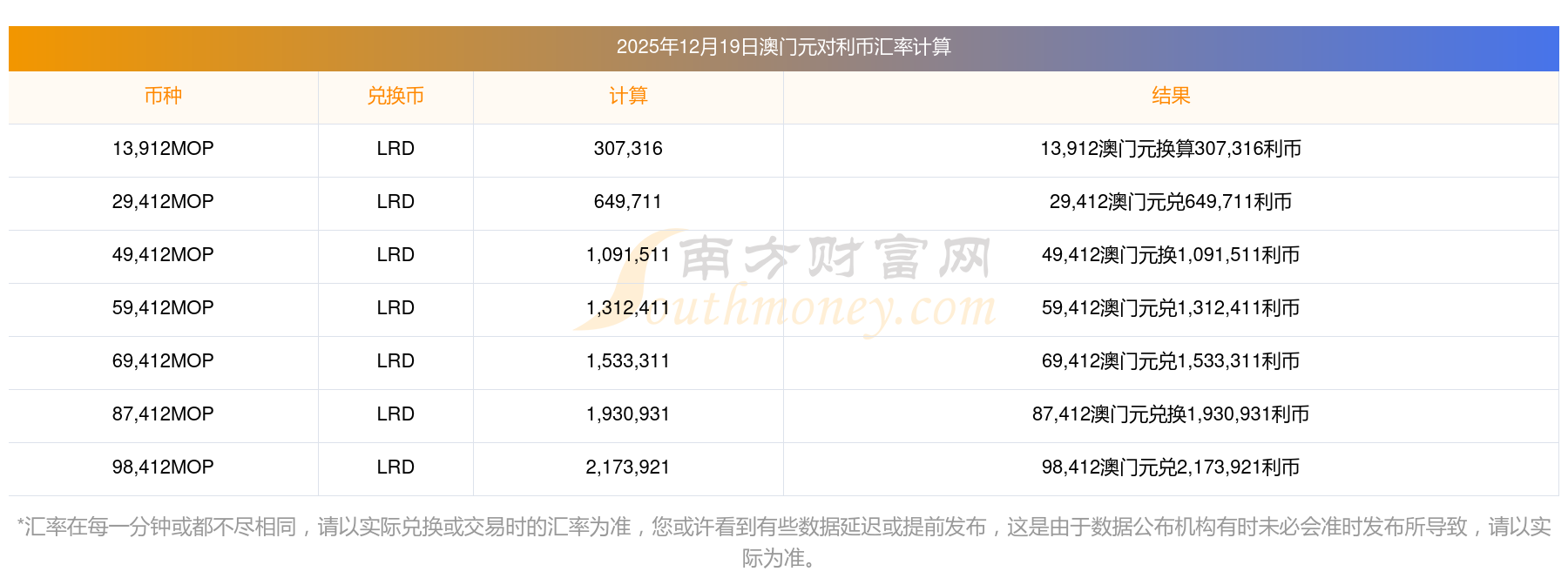 澳門元對利幣今日匯率查詢 1元能兌換多少? 2025-12-19