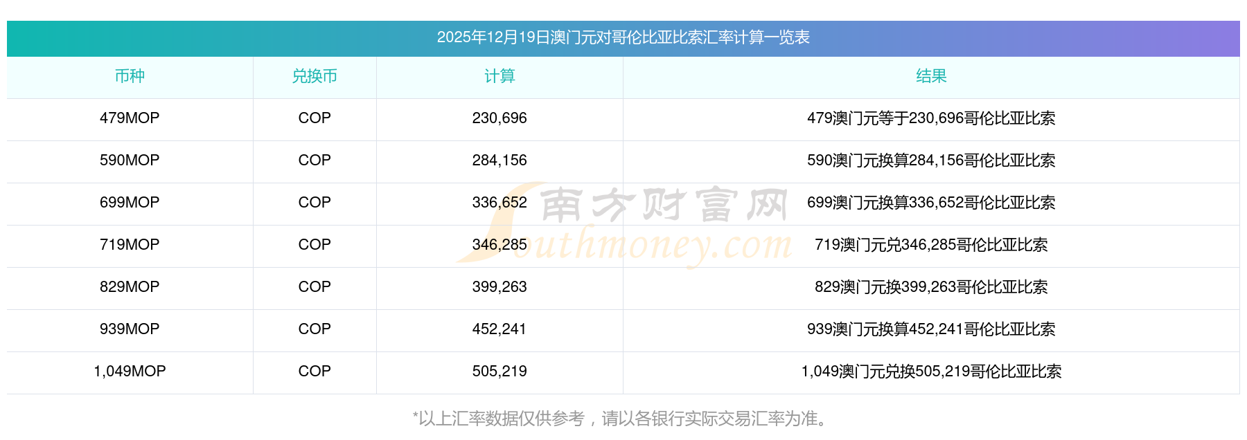 2025年12月19日澳門元兌換哥倫比亞比索匯率是:481.62