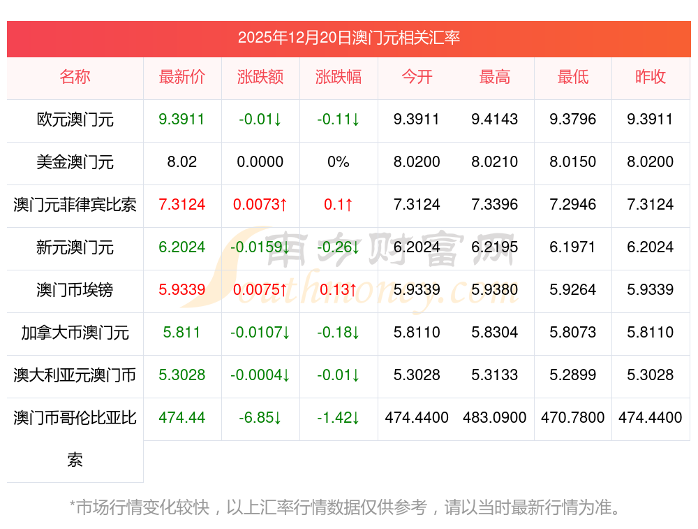 根據(jù)2025年12月20日匯率計算,MOP兌換ARS匯率最新價180.704600:今日開價180.7046,昨日收價180.7046,最高價181.3165,最低價180.7046。