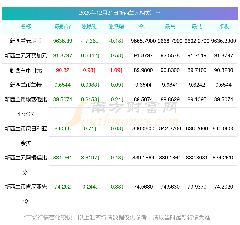 2025年12月21日新西蘭元相關(guān)匯率查詢