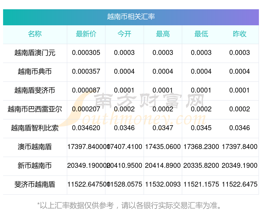 南方財富網(wǎng)為您提供越南幣對埃鎊匯率最新價格詳情。