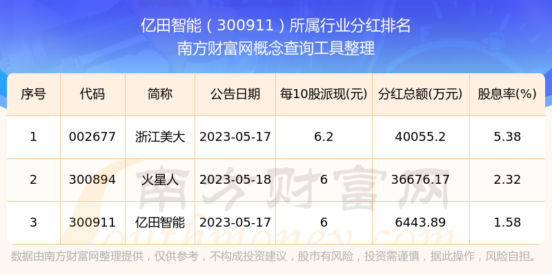 按照南方財富網(wǎng)趨勢選股系統(tǒng)統(tǒng)計,億田智能所屬行業(yè)為集成灶行業(yè),集成灶行業(yè)分紅排名情況如下表: