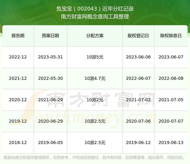 兔寶寶最新一次公布的分紅方案為10派5元。本次權(quán)益分派股權(quán)登記日為2023年6月6日,除權(quán)除息日為2023年6月7日,派息日為2023年6月7日。