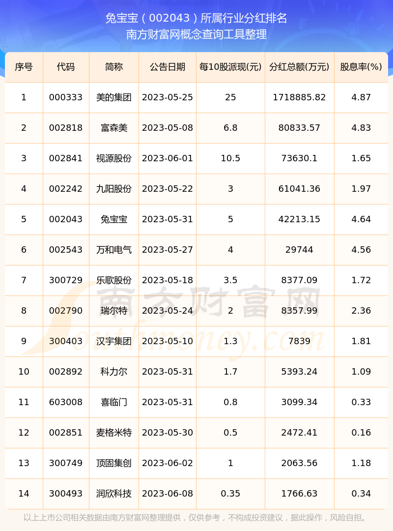 按照南方財(cái)富網(wǎng)趨勢(shì)選股系統(tǒng)統(tǒng)計(jì),兔寶寶所屬行業(yè)為裝修建材行業(yè),裝修建材行業(yè)分紅排名情況如下表: