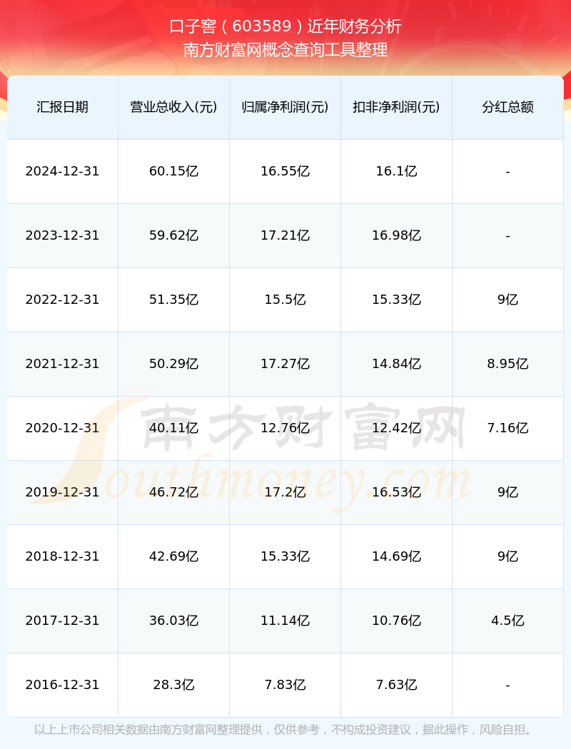 口子窖2024年總營收60.15億,同比增長0.89%;凈利潤16.55億,同比增長-3.83%;銷售毛利率74.59%。