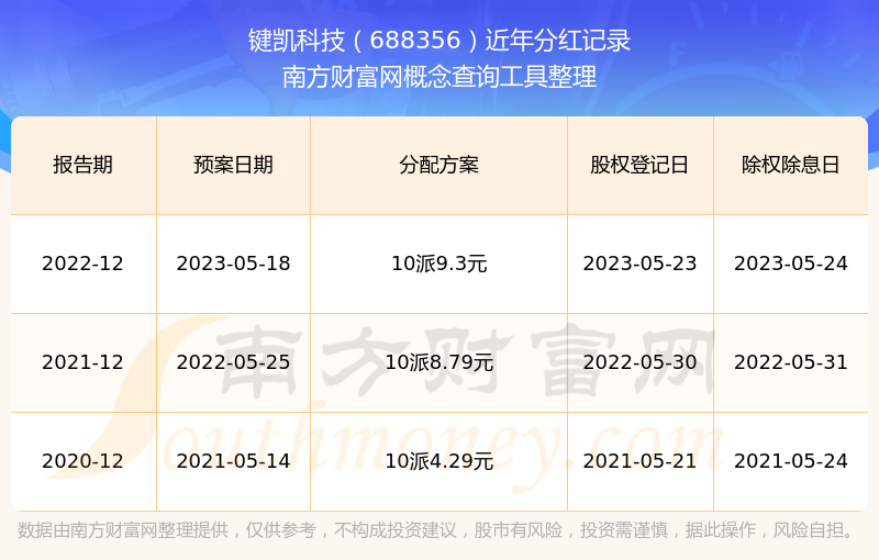 鍵凱科技最新一次公布的分紅方案為10派9.3元。本次權(quán)益分派股權(quán)登記日為2023年5月23日,除權(quán)除息日為2023年5月24日,派息日為2023年5月24日。