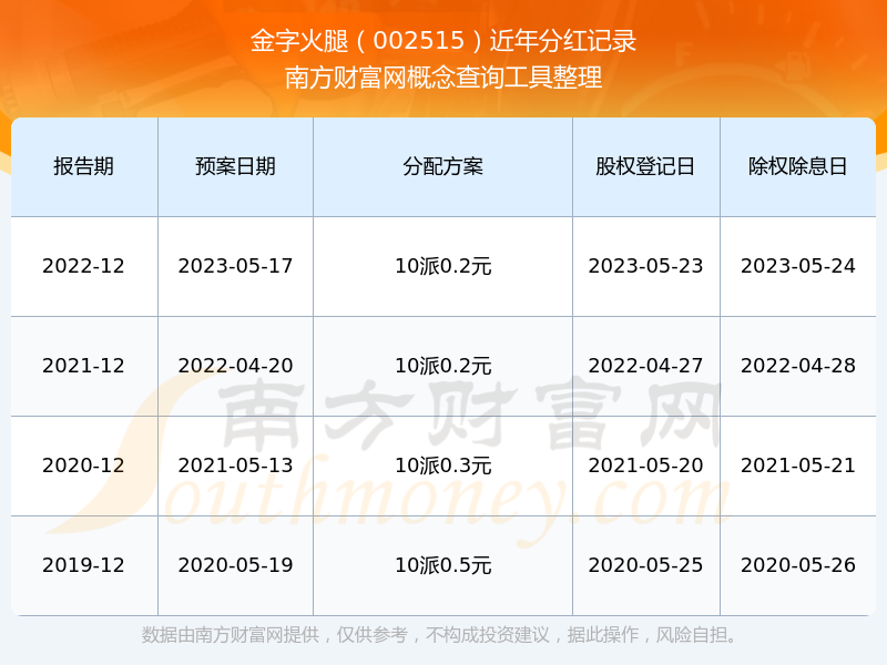 金字火腿最新一次公布的分紅方案:10派0.2元。