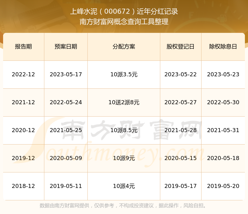 上峰水泥最新一次公布的分紅方案為10派3.5元。本次權(quán)益分派股權(quán)登記日為2023年5月22日,除權(quán)除息日為2023年5月23日,派息日為2023年5月23日。