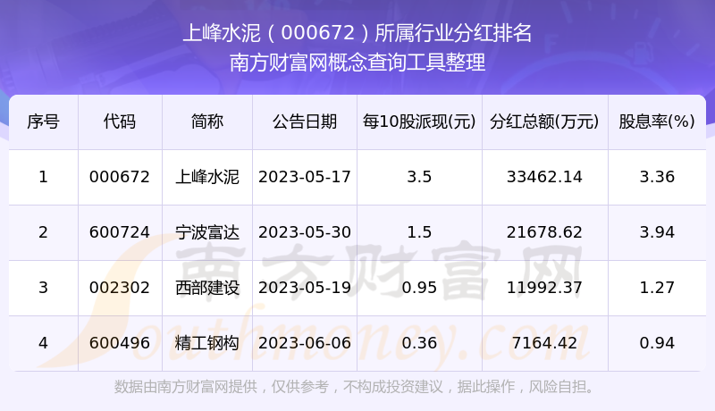 按照南方財(cái)富網(wǎng)趨勢(shì)選股系統(tǒng)統(tǒng)計(jì),上峰水泥所屬行業(yè)為水泥建材行業(yè),水泥建材行業(yè)分紅排名情況如下表:
