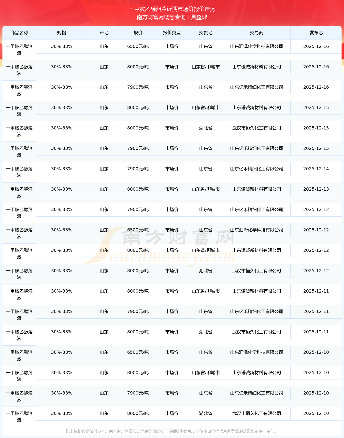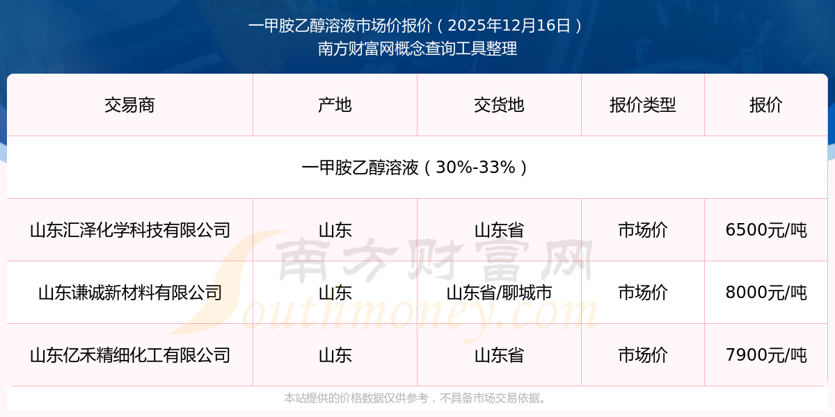 2025年12月16日,山東億禾精細化工有限公司一甲胺乙醇溶液(30%-33%),山東,交易地點為山東省,市場價報價為7900.00元/噸。