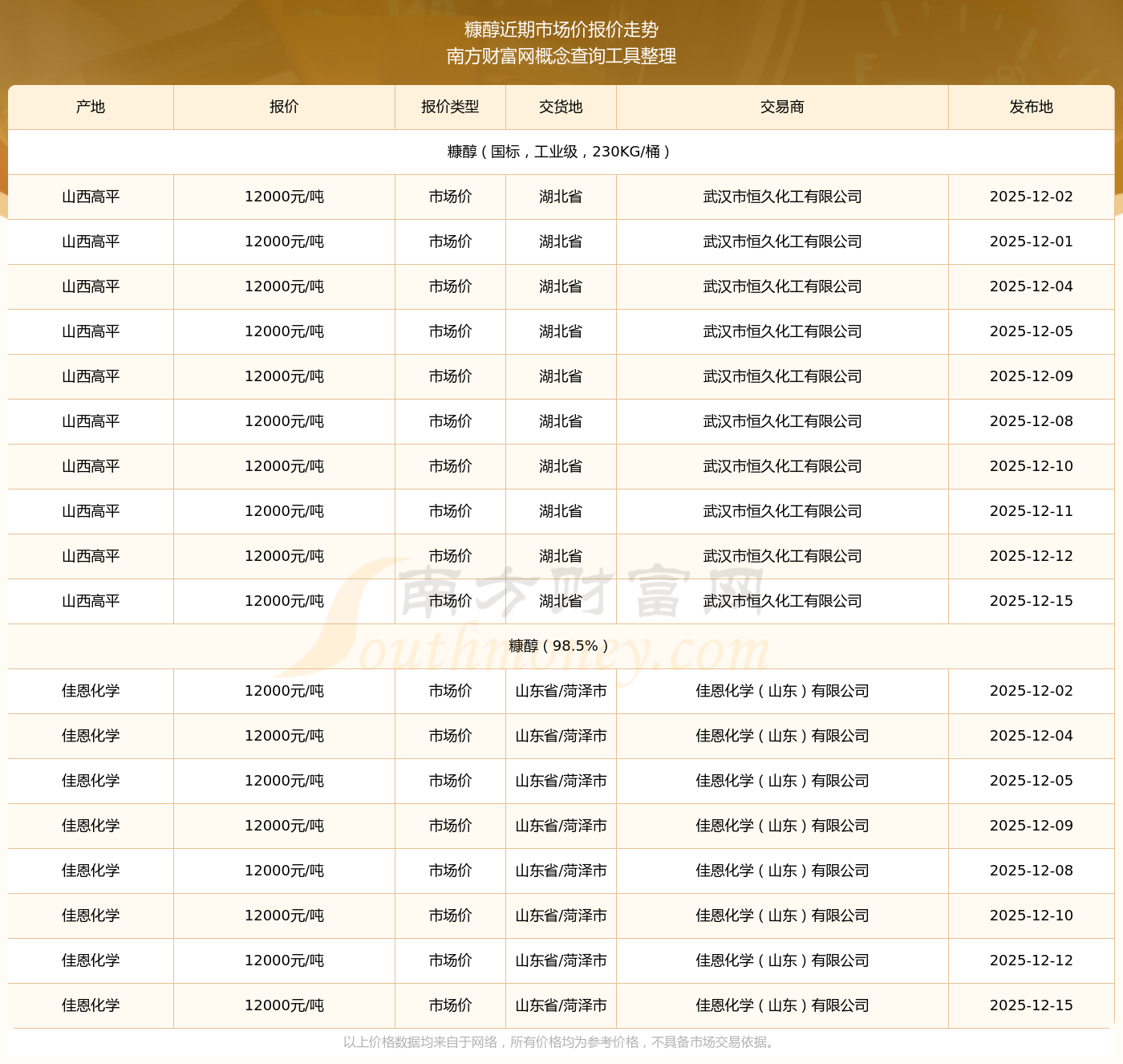 2025年12月15日,武漢市恒久化工有限公司糠醇(國標,工業(yè)級,230KG/桶),山西高平,交易地點為湖北省,市場價報價為12000.00元/噸。