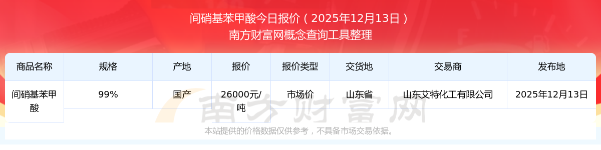 2025年12月13日,間硝基苯甲酸(99%)市場價價格為26000.00元/噸,報價人:山東艾特化工有限公司,交易地點(diǎn)為山東省。