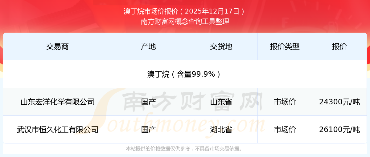 2025年12月17日,溴丁烷(含量99.9%)市場價價格為24300.00元/噸,報價人:山東宏洋化學(xué)有限公司,交易地點為山東省。