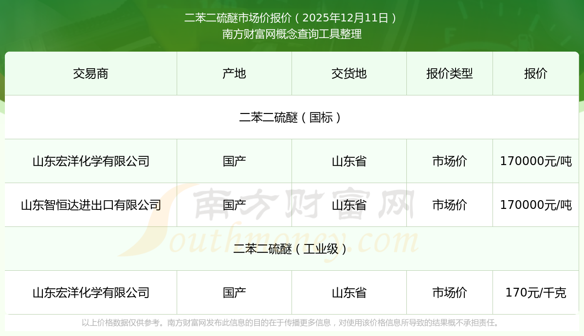 2025年12月11日,二苯二硫醚(國標(biāo))市場價價格為170000.00元/噸,報價人:山東宏洋化學(xué)有限公司,交易地點為山東省。