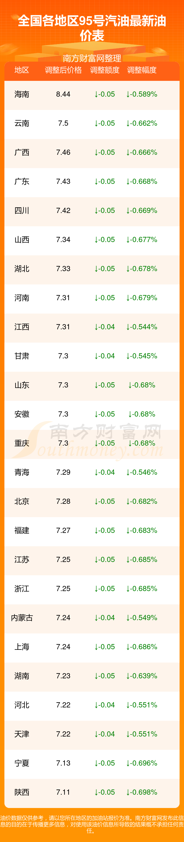 全國(guó)95號(hào)汽油平均價(jià)格為:7元每升,其中,最低為陜西,價(jià)格7.11元/升,最高為海南,價(jià)格8.44元/升。