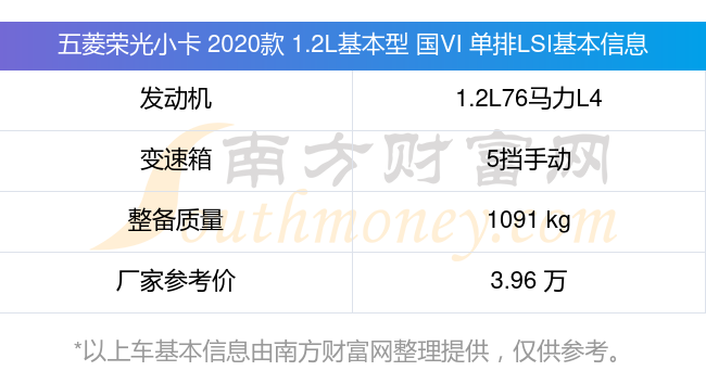 五菱榮光小卡 2020款 1.2L基本型 國VI 單排LSI動力方面,搭載的是一臺1.2L76馬力L4自然吸氣發(fā)動機,匹配5擋手動擋變速箱,燃料形式為汽油,常規(guī)整備質(zhì)量1091kg,廠家參考價3.96萬元。