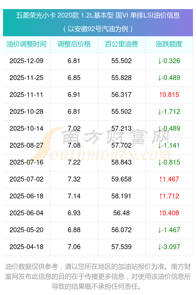 按照12月9日92號汽油最新調(diào)整價格6.81元/升來計算(以安徽為例),該車型百公里平均油費為55.502元,按照上一輪11月25日調(diào)整價格6.85元/升來計算,百公里平均油費為55.828元,對比上一輪少花0.326元,下一輪油價調(diào)整時間為12月22日24時。