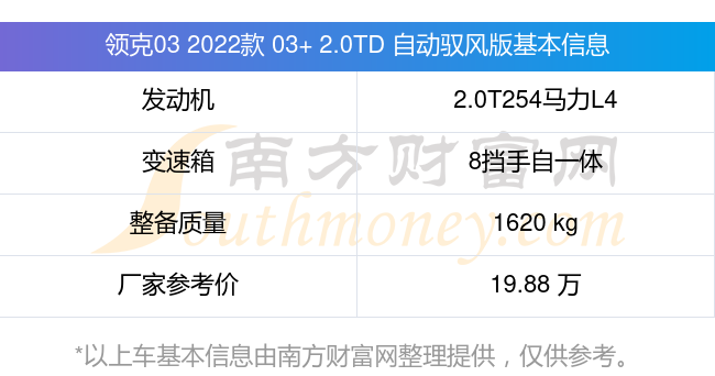 領(lǐng)克03 2022款 03+ 2.0TD 自動(dòng)馭風(fēng)版搭載了一臺(tái)2.0T254馬力L4渦輪增壓發(fā)動(dòng)機(jī),采用8擋手自一體自動(dòng)檔變速箱,常規(guī)整備質(zhì)量1620kg,廠(chǎng)家參考價(jià)19.88萬(wàn)元。