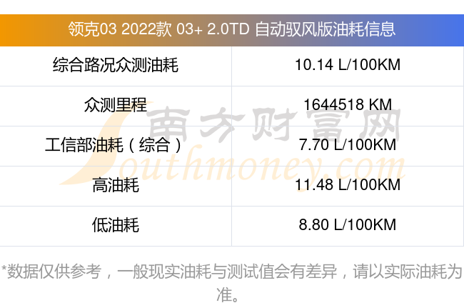 根據(jù)車(chē)主實(shí)測(cè)數(shù)據(jù),該車(chē)型低油耗為8.80升/百公里,高油耗為11.48升/百公里,綜合路況眾測(cè)油耗為10.14升/百公里,工信部綜合油耗為7.70升/百公里。