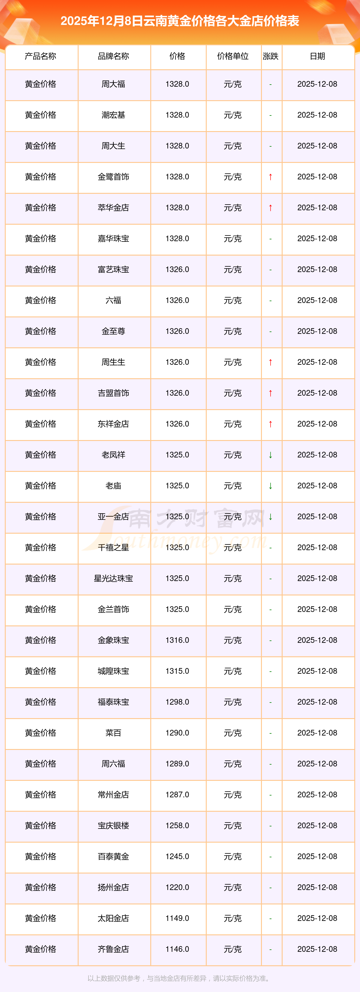 云南黃金價格最高的金店是周大福,報價1328.0元/克,最低的是齊魯金店,報價1146.0元/克。今日黃金價格高低差為182元/克。