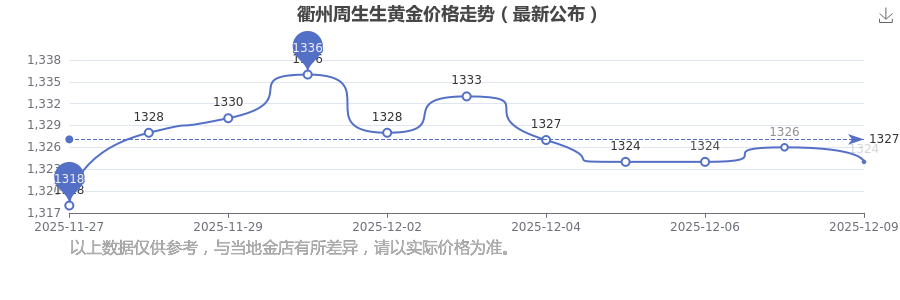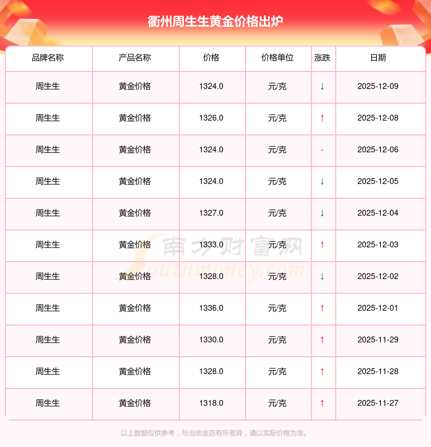 于 2025年12月9日,衢州周生生黃金價格的克價為1324.0元/克。