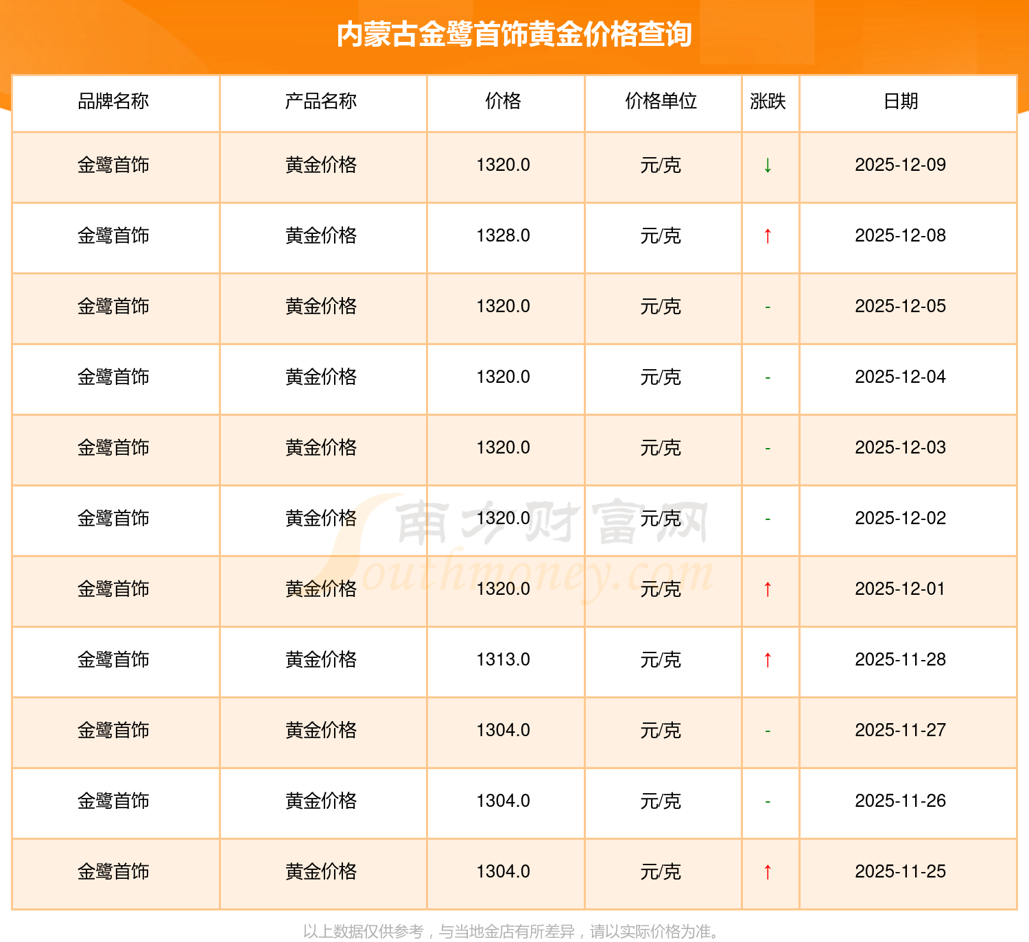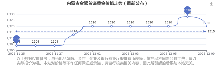 2025年12月9日,內(nèi)蒙古金鷺首飾黃金價(jià)格每克的售賣價(jià)位為1320.0元/克。