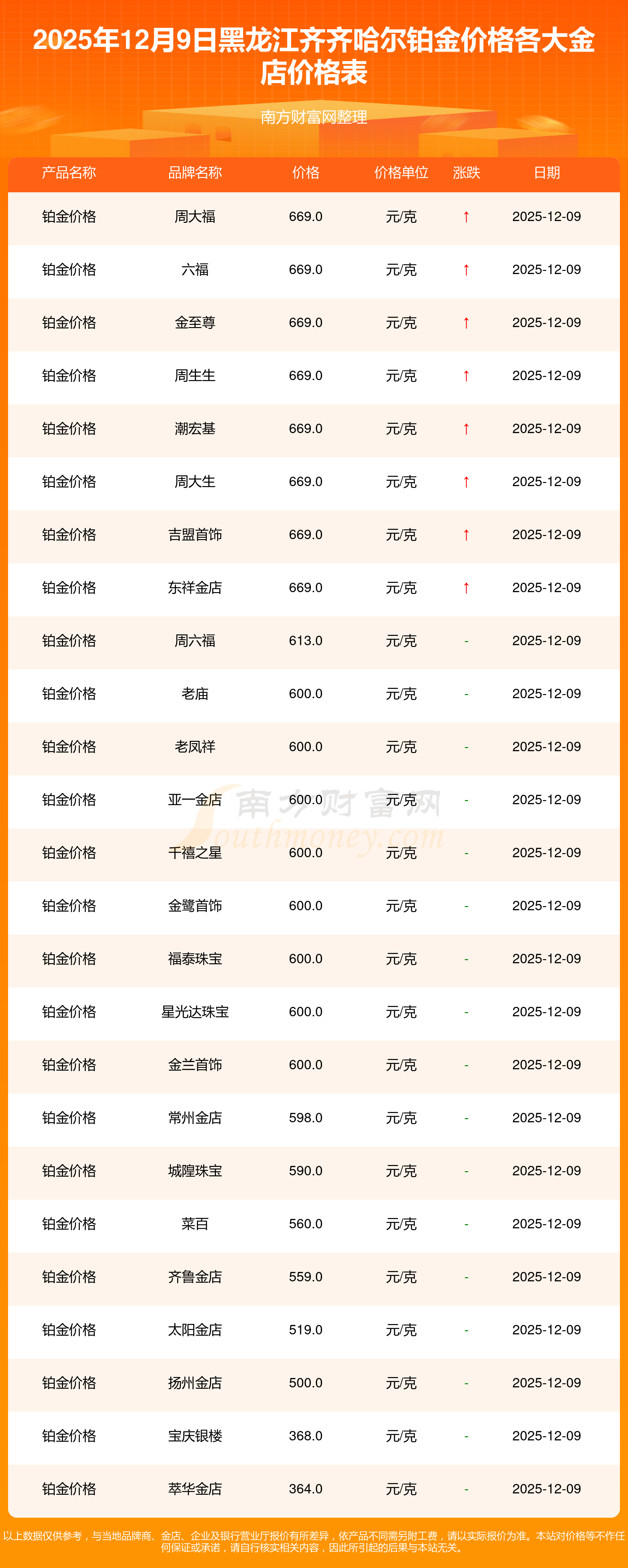 今天是2025年12月9日,黑龍江齊齊哈爾周大福、周大福、周大福、周大福、周大福、周大福、周大福、周六福、周六福、周六福、周六福等各大金店品牌鉑金價(jià)格最新價(jià)格如下:周大福1328.0元/克、周大福669.0元/克、周大福1328.0元/克、周大福46520.0、周大福19190.0、周大福41960.0、周大福1165.0元/克、周六福1289.0元/克、周六福613.0元/克、周六福613.0元/克、周六福1184.0元/克。