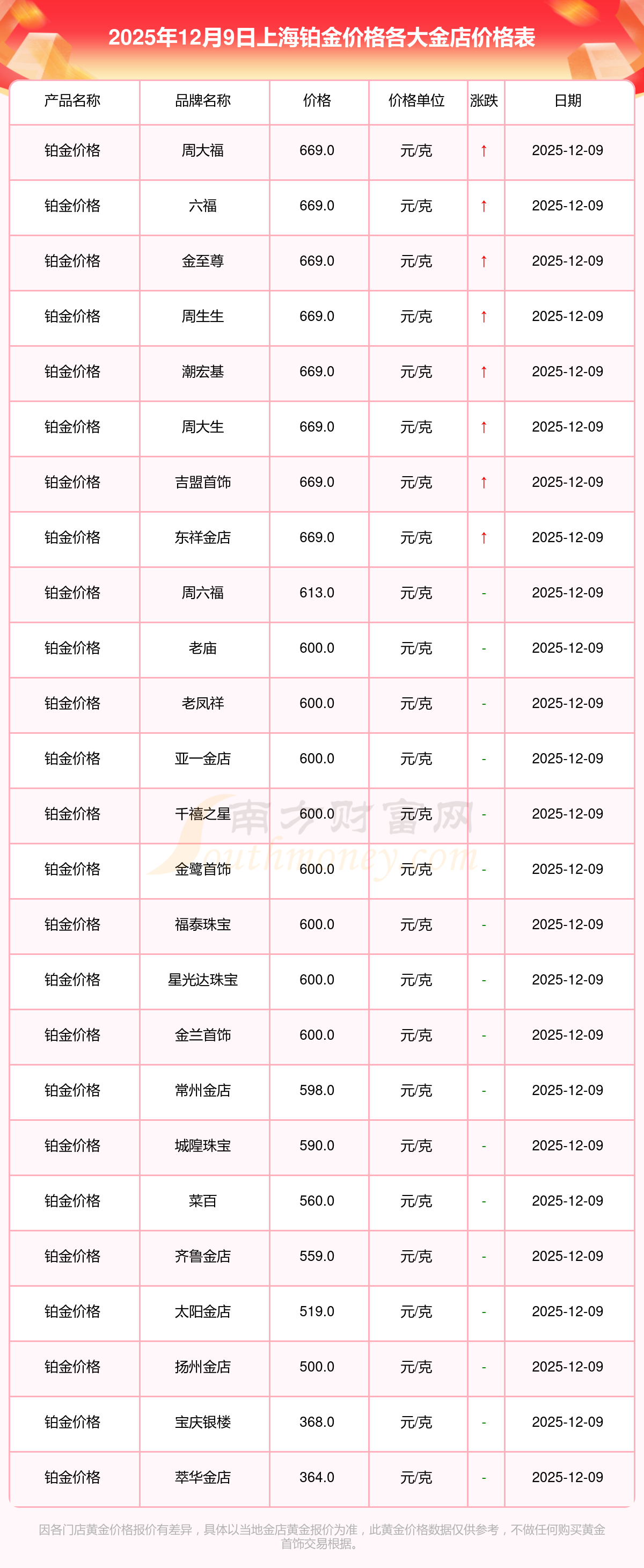 2025年12月9日上海各大金店鉑金價格最新價格查詢來了:周大福1328.0元/克,周大福669.0元/克,周大福1328.0元/克,周大福46520.0,周大福19190.0,周大福41960.0,周大福1165.0元/克,周六福1289.0元/克,周六福613.0元/克,周六福613.0元/克,周六福1184.0元/克。