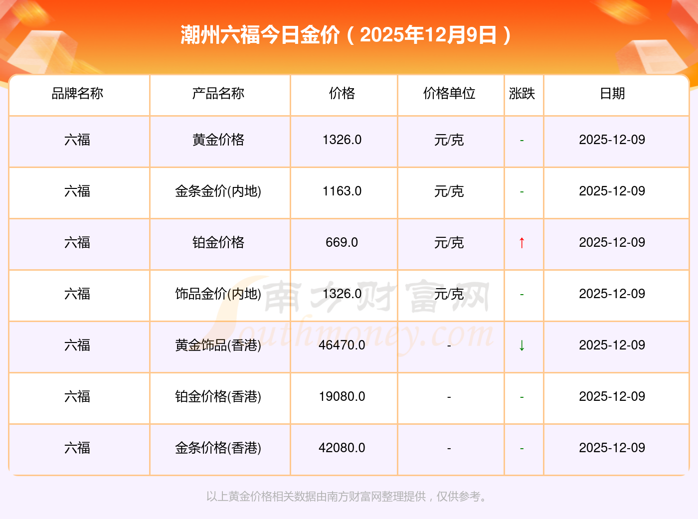 今日黃金價(jià)格是怎樣的?當(dāng)下黃金一克要賣多少錢?2025年12月9日潮州六,F(xiàn)在黃金一克要多少錢:黃金價(jià)格1328.0元/克,鉑金價(jià)格669.0元/克,飾品金價(jià)(內(nèi)地)1328.0元/克,黃金飾品(香港)46520.0,鉑金價(jià)格(香港)19190.0,金條價(jià)格(香港)41960.0,金條金價(jià)(內(nèi)地)1165.0元/克,黃金價(jià)格1289.0元/克,鉑金價(jià)格613.0元/克,PT999鉑金價(jià)格613.0元/克,金條價(jià)格1184.0元/克。