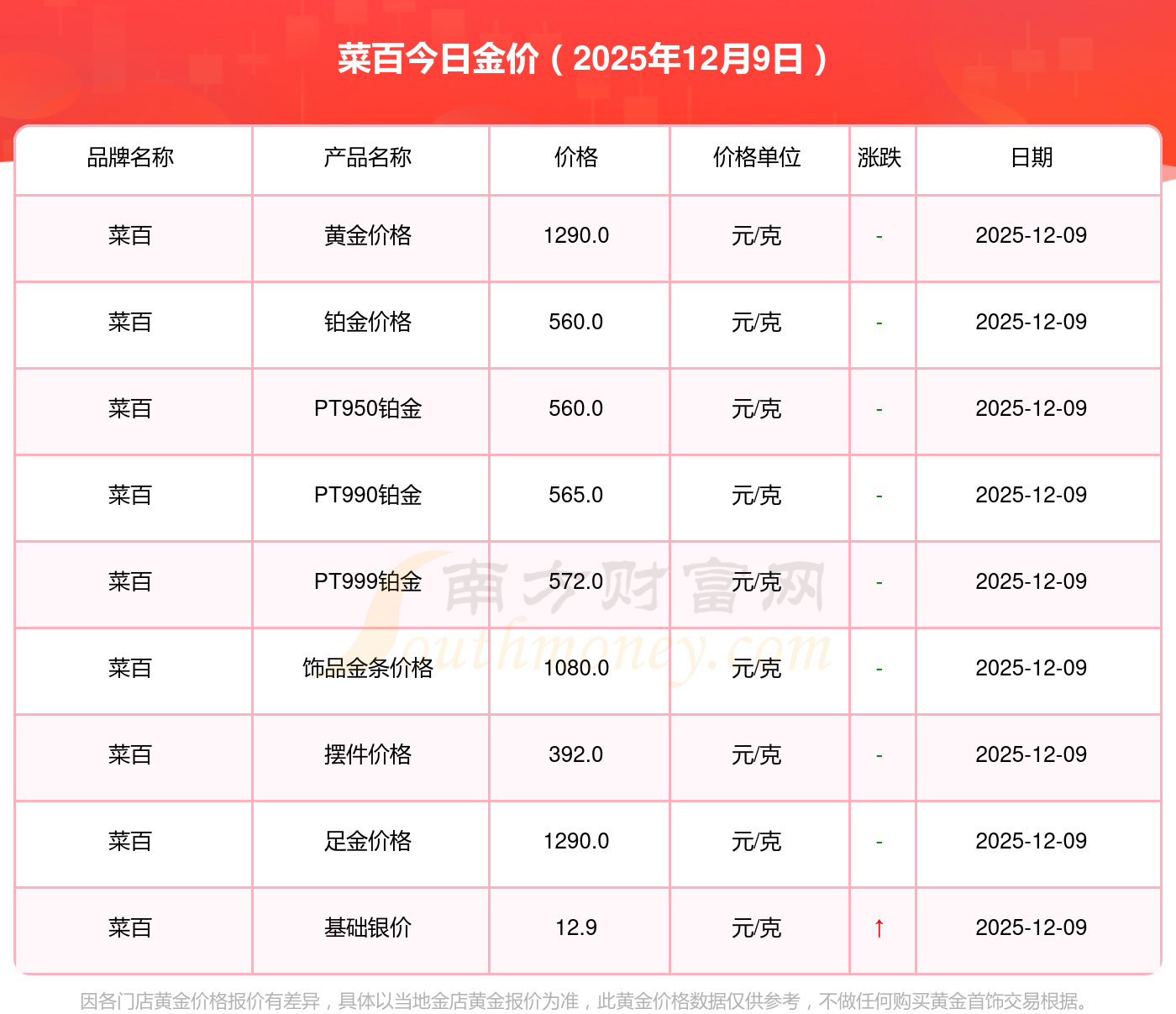 2025年12月9日菜百今日價(jià)格:黃金價(jià)格1328.0元/克,鉑金價(jià)格669.0元/克,飾品金價(jià)(內(nèi)地)1328.0元/克,黃金飾品(香港)46520.0,鉑金價(jià)格(香港)19190.0,金條價(jià)格(香港)41960.0,金條金價(jià)(內(nèi)地)1165.0元/克,黃金價(jià)格1289.0元/克,鉑金價(jià)格613.0元/克,PT999鉑金價(jià)格613.0元/克,金條價(jià)格1184.0元/克。