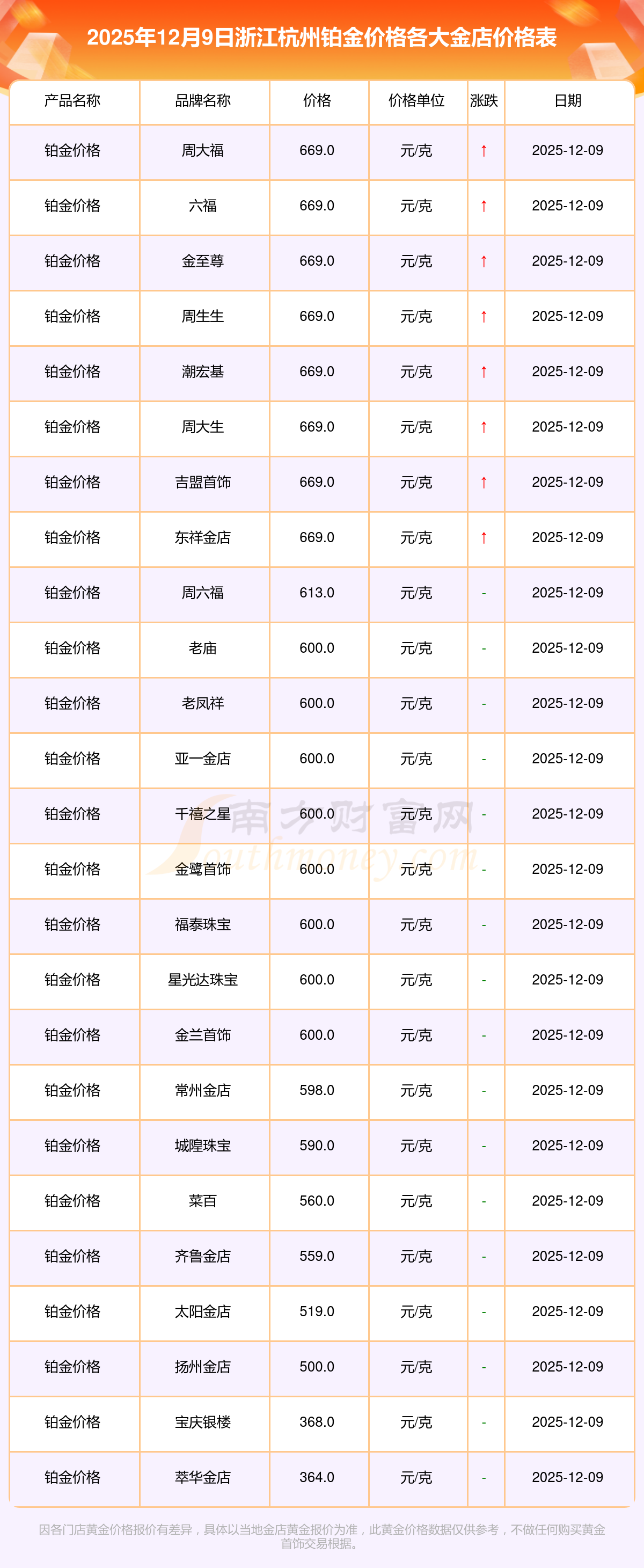 2025年12月9日浙江杭州各大金店鉑金價(jià)格最新價(jià)格:周大福1328.0元/克,周大福669.0元/克,周大福1328.0元/克,周大福46520.0,周大福19190.0,周大福41960.0,周大福1165.0元/克,周六福1289.0元/克,周六福613.0元/克,周六福613.0元/克,周六福1184.0元/克。