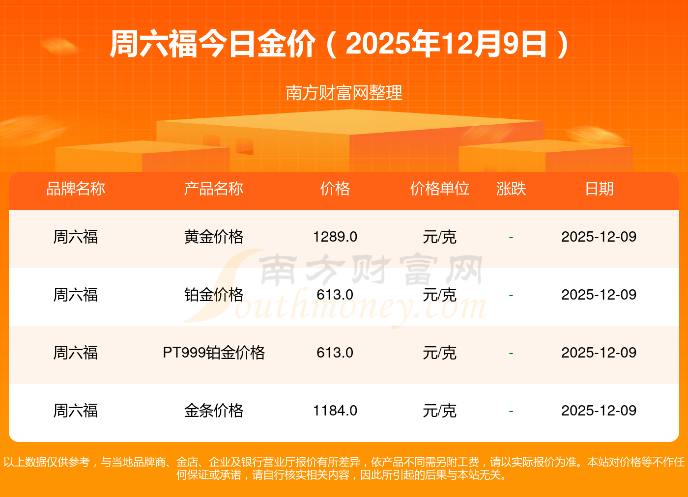 2025年12月9日周六福最新價(jià)格:黃金價(jià)格1328.0元/克,鉑金價(jià)格669.0元/克,飾品金價(jià)(內(nèi)地)1328.0元/克,黃金飾品(香港)46520.0,鉑金價(jià)格(香港)19190.0,金條價(jià)格(香港)41960.0,金條金價(jià)(內(nèi)地)1165.0元/克,黃金價(jià)格1289.0元/克,鉑金價(jià)格613.0元/克,PT999鉑金價(jià)格613.0元/克,金條價(jià)格1184.0元/克。