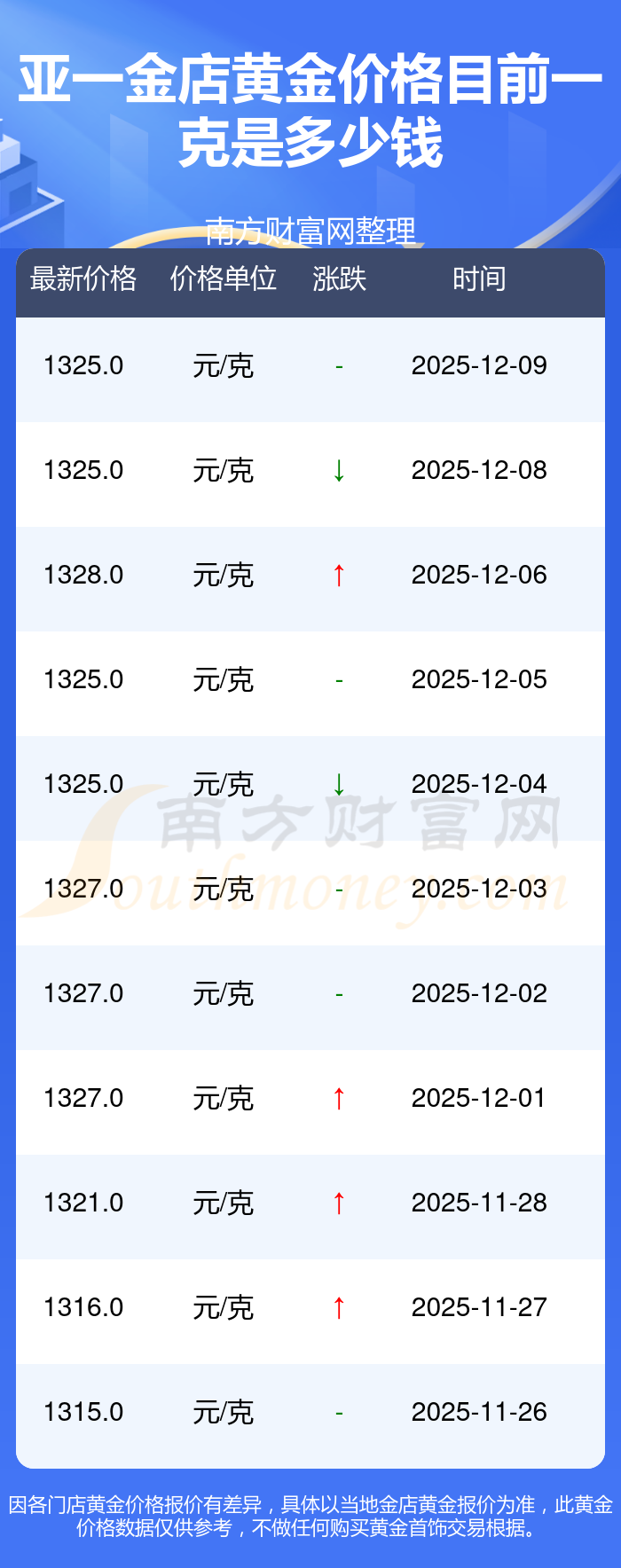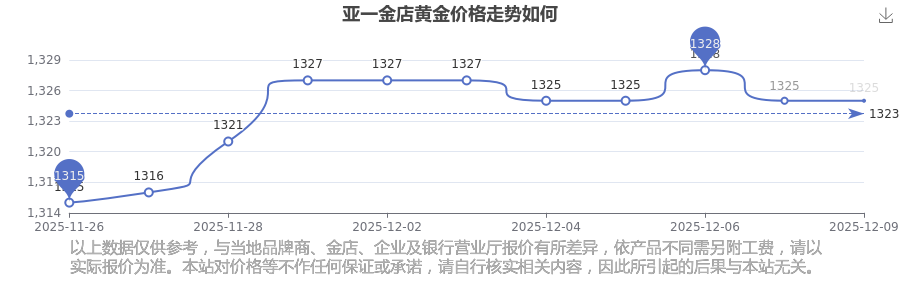 今日黃金價格查詢_現(xiàn)在金價黃金一克多少錢,黃金價格是多少錢一克?黃金價格一般是多少錢一克?今日亞一金店黃金價格最新價格為1325.0元/克。
