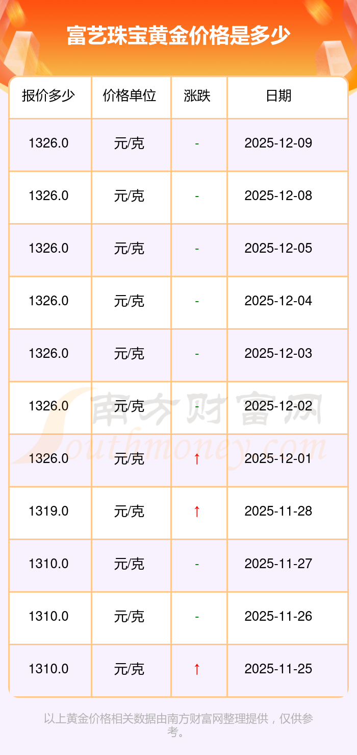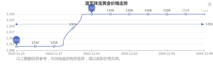 今日(2025年12月9日)富藝珠寶黃金價格的價格為1326.0元/克。