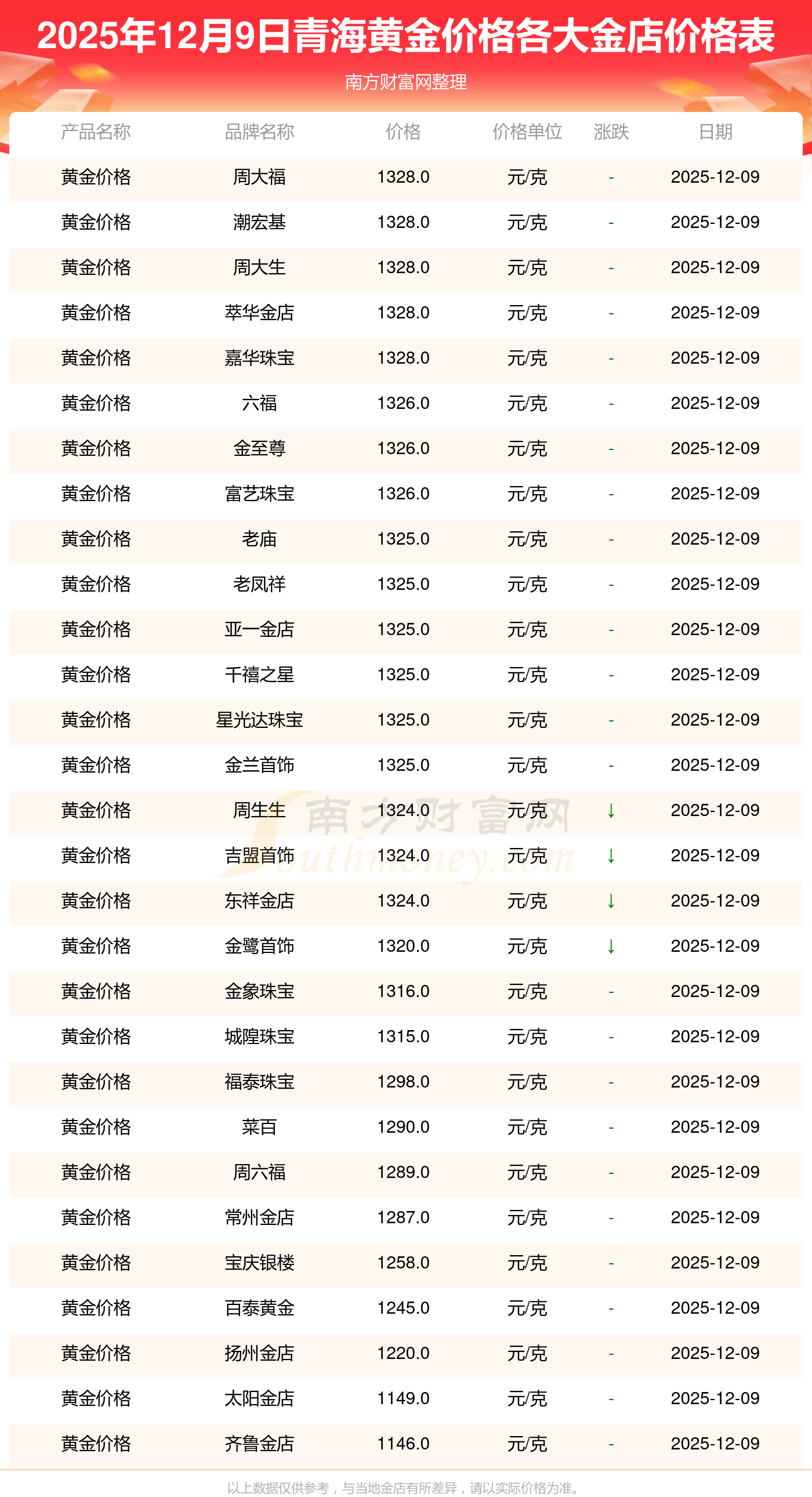 2025年12月9日青海各大金店黃金價(jià)格最新價(jià)格:周大福1328.0元/克,周大福669.0元/克,周大福1328.0元/克,周大福46520.0,周大福19190.0,周大福41960.0,周大福1165.0元/克,周六福1289.0元/克,周六福613.0元/克,周六福613.0元/克,周六福1184.0元/克。