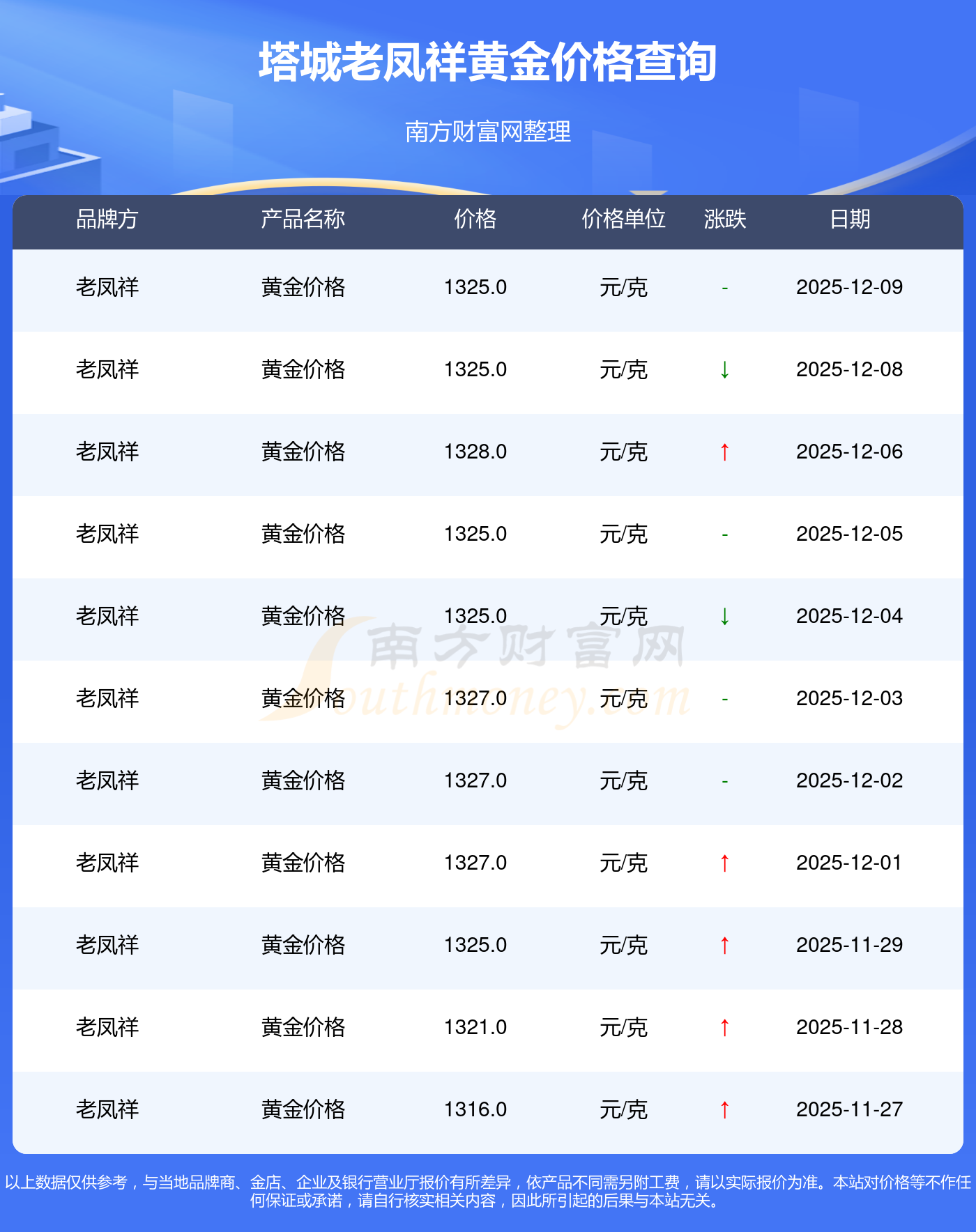 今日(2025年12月9日),塔城老鳳祥黃金價(jià)格:1325.0元/克。