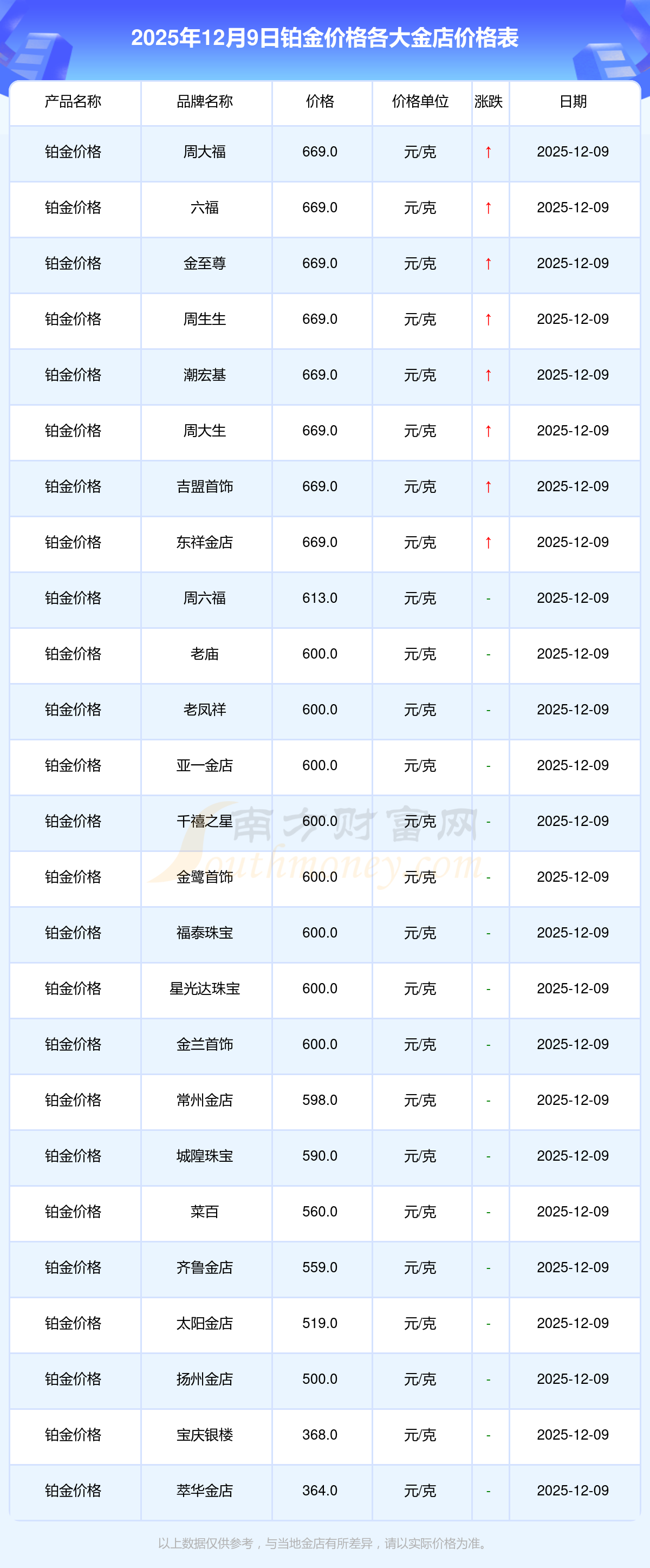 2025年12月9日各大金店鉑金價(jià)格最新價(jià)格:周大福1328.0元/克,周大福669.0元/克,周大福1328.0元/克,周大福46520.0,周大福19190.0,周大福41960.0,周大福1165.0元/克,周六福1289.0元/克,周六福613.0元/克,周六福613.0元/克,周六福1184.0元/克。