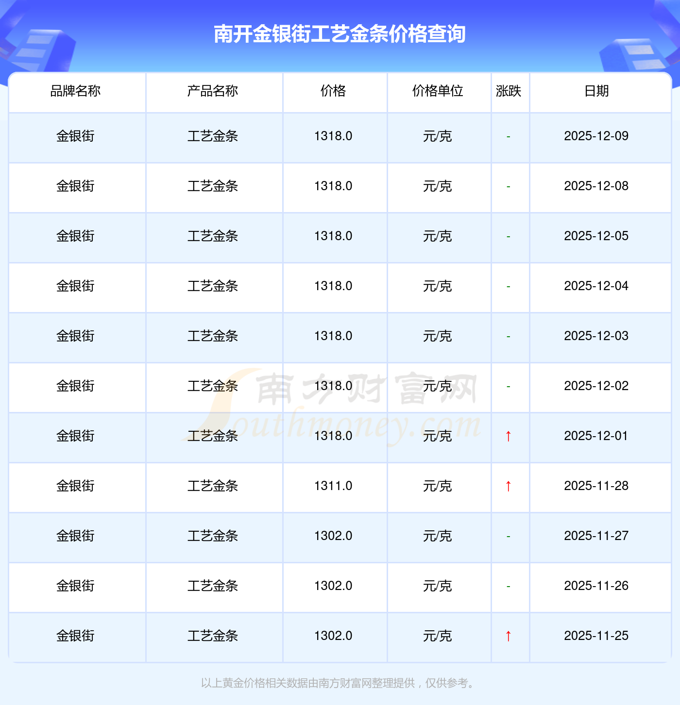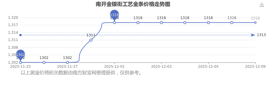 今日(2025年12月9日),南開金銀街工藝金條價(jià)格:1318.0元/克。