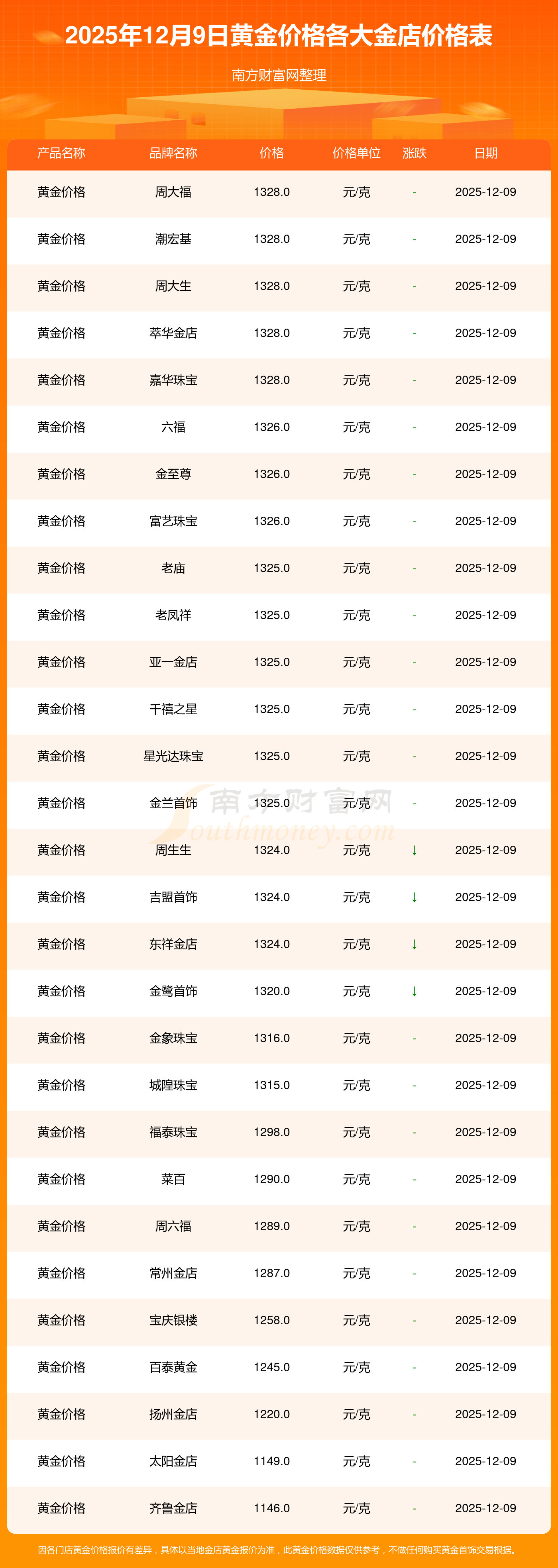 2025年12月9日各大金店黃金價格最新價格:周大福1328.0元/克,周大福669.0元/克,周大福1328.0元/克,周大福46520.0,周大福19190.0,周大福41960.0,周大福1165.0元/克,周六福1289.0元/克,周六福613.0元/克,周六福613.0元/克,周六福1184.0元/克。