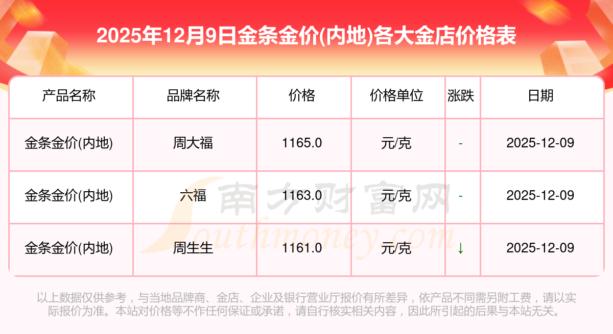今天是2025年12月9日,周大福、周大福、周大福、周大福、周大福、周大福、周大福、周六福、周六福、周六福、周六福等各大金店品牌金條金價(jià)(內(nèi)地)最新價(jià)格如下:周大福1328.0元/克、周大福669.0元/克、周大福1328.0元/克、周大福46520.0、周大福19190.0、周大福41960.0、周大福1165.0元/克、周六福1289.0元/克、周六福613.0元/克、周六福613.0元/克、周六福1184.0元/克。