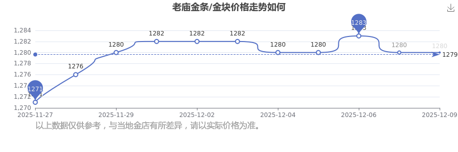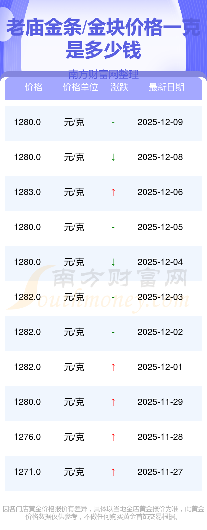 最新數(shù)據(jù)表明,老廟今日 金條/金塊價格為1280.0元/克。