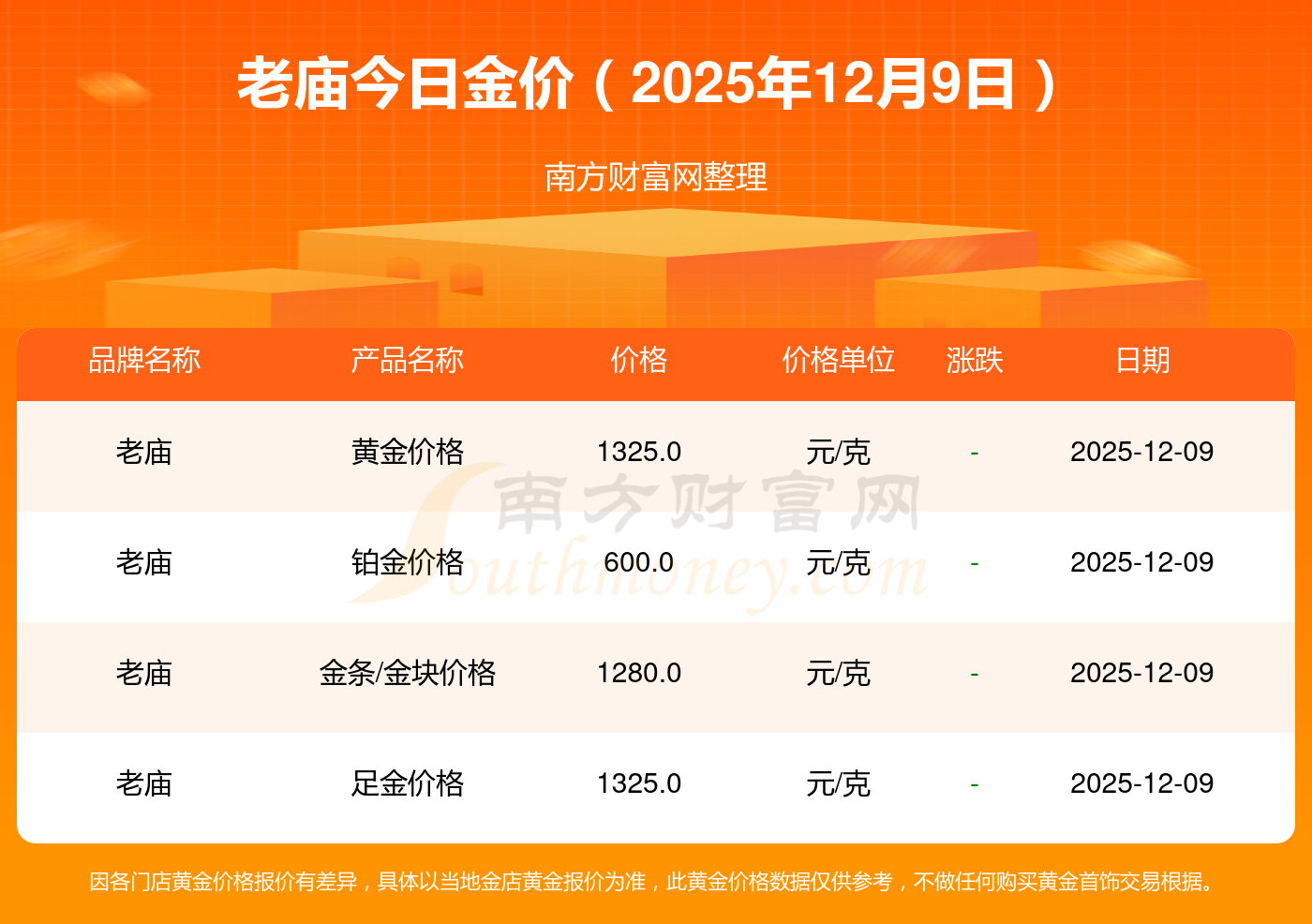 2025年12月9日老廟金價(jià)查詢:黃金價(jià)格1328.0元/克,鉑金價(jià)格669.0元/克,飾品金價(jià)(內(nèi)地)1328.0元/克,黃金飾品(香港)46520.0,鉑金價(jià)格(香港)19190.0,金條價(jià)格(香港)41960.0,金條金價(jià)(內(nèi)地)1165.0元/克,黃金價(jià)格1289.0元/克,鉑金價(jià)格613.0元/克,PT999鉑金價(jià)格613.0元/克,金條價(jià)格1184.0元/克。