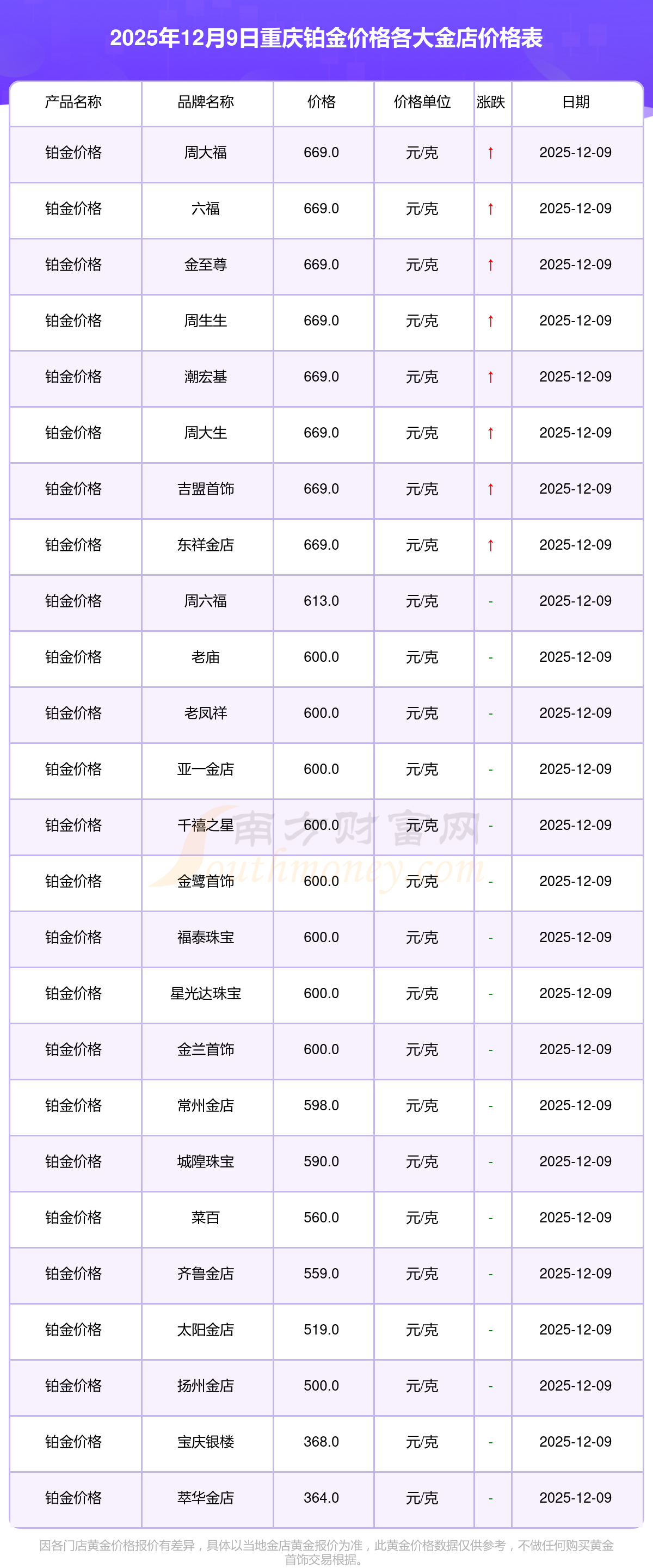 2025年12月9日,重慶周大福、周大福、周大福、周大福、周大福、周大福、周大福、周六福、周六福、周六福、周六福等各大金店品牌鉑金價格今日價格行情最新來了:周大福1328.0元/克、周大福669.0元/克、周大福1328.0元/克、周大福46520.0、周大福19190.0、周大福41960.0、周大福1165.0元/克、周六福1289.0元/克、周六福613.0元/克、周六福613.0元/克、周六福1184.0元/克。