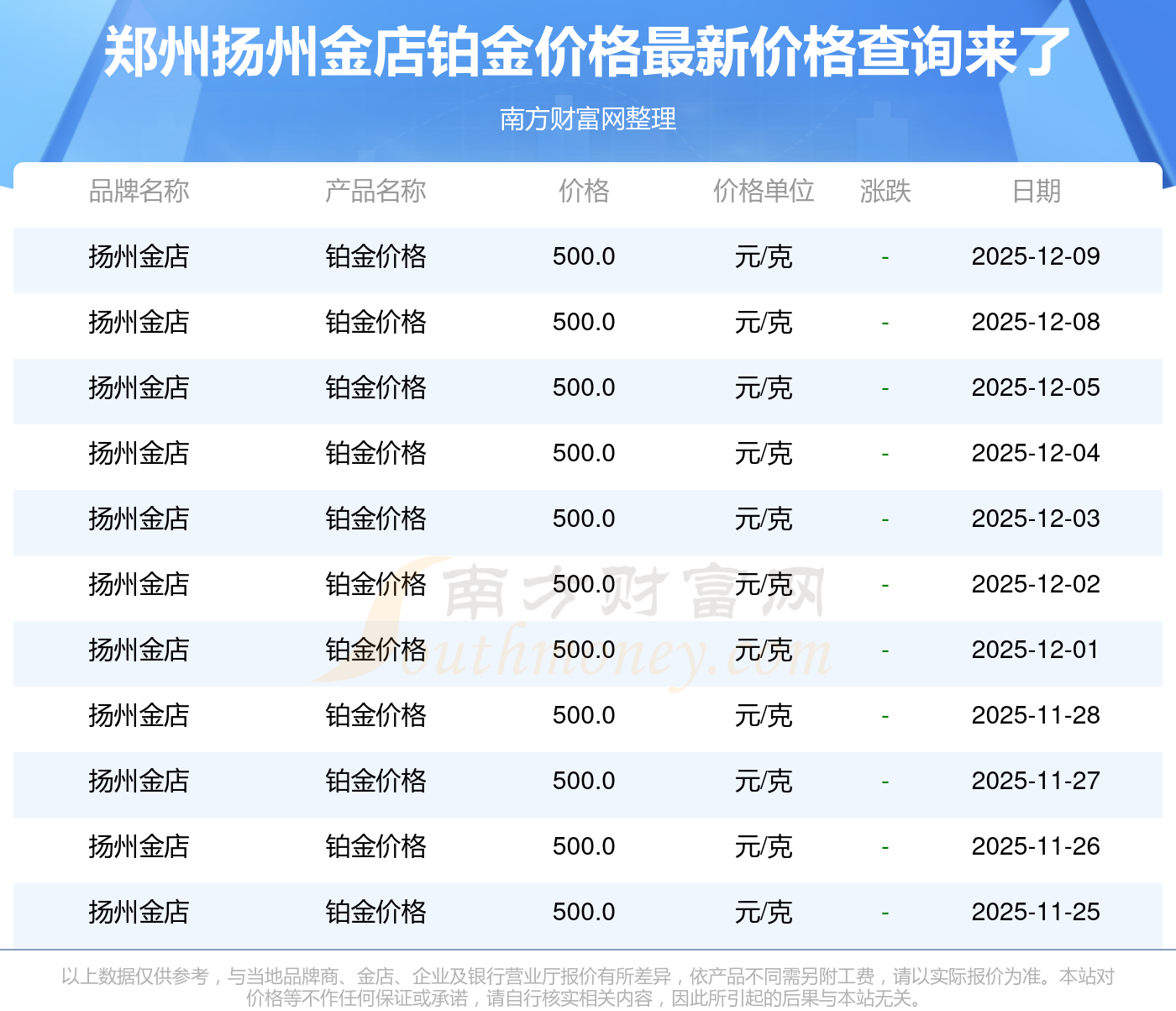 今日(2025年12月9日),鄭州揚(yáng)州金店鉑金價格的價格是500.0元/克。